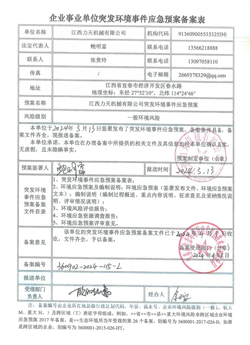 企業事業單位突發環境事件應急預案備案表